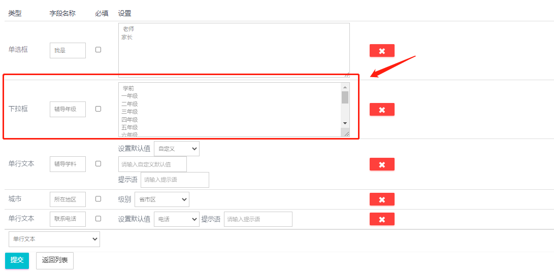 选中类型后点击添加字段,类型有:单行文本、多行文本、下拉框、多选框、单选框、图片、日期、城市、账号密码(账号密码是用于供应商申请表单使用时才会显示)。每个字段可以拖动互换位置。