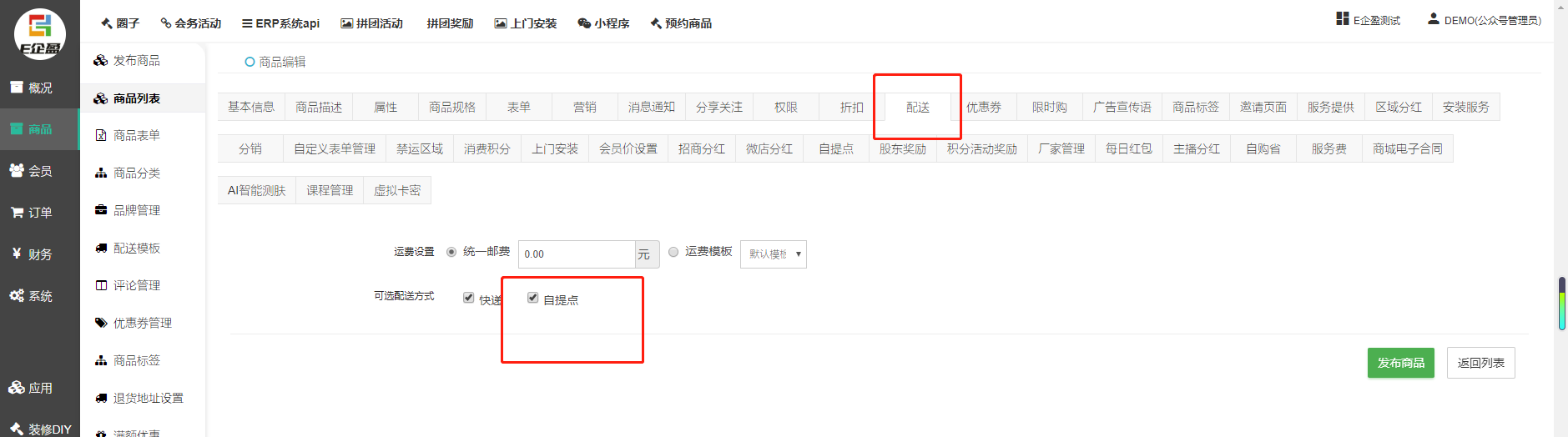 路径:商品列表--编辑商品--配送--可选配送方式:快递or自提。注:可勾选其中一项,若都不勾选,保存后默认都勾选。商品须为实物商品,且填写地址。虚拟商品不支持自提,因一付款订单就直接完成收货,跳过发货收货步骤。
