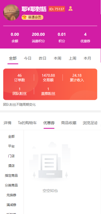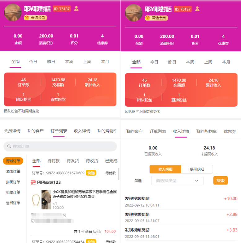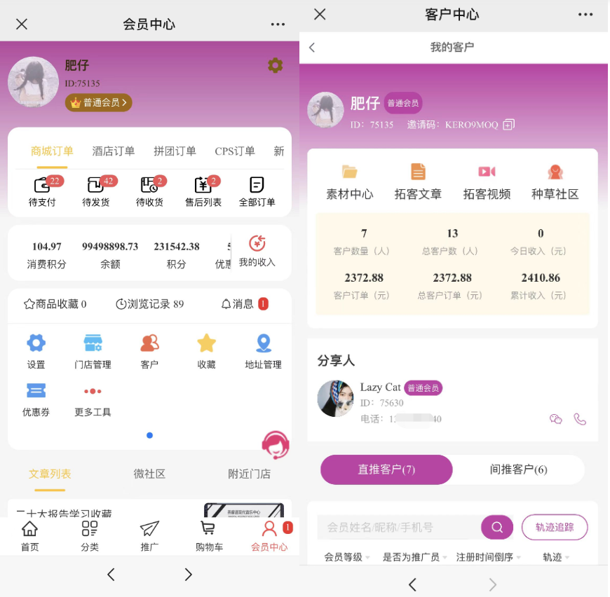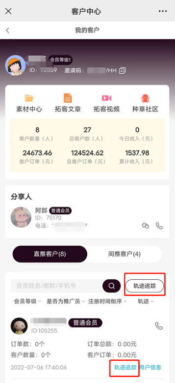 利用客户中心功能,会员可以掌握直推和间推客户的喜好动向,持续让他们买买买,以此来获得更多的收益轨迹追踪 推荐客户详情查看 全方位跟进客户动态。支持微信端、小程序端,若需要轨迹追踪,要搭配“浏览轨迹”插件使用!