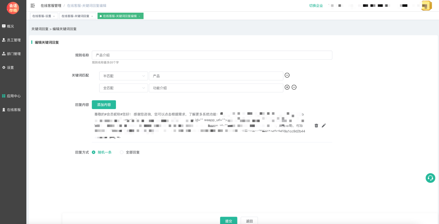随机回复:如果关键词匹配成功,随机回复设置内容的其中一条;