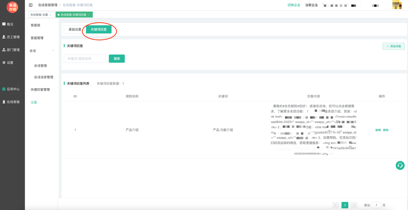 企业管理PC端--在线客服插件--设置--基础设置中开启关键词自动回复,如下图: