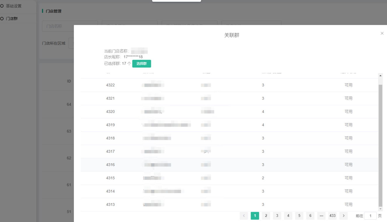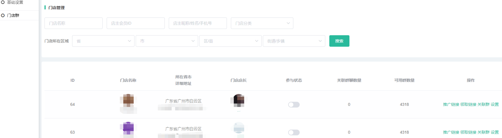 1、基础设置开启门店后,只有开启了参与状态和有关联群的门店才会在前端加群页显示