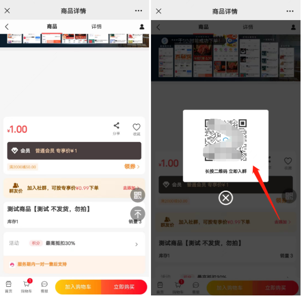 商品详情页显示效果,未加入群会显示去添加,点击去添加弹出加群二维码,长按识别加群,加入群聊(需要选择商品模板02)