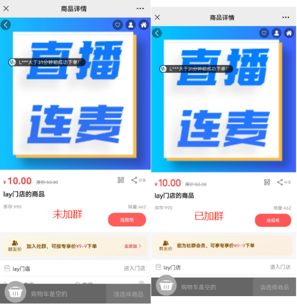 加入群聊--商品详情页显示效果,提示您为社群会员,可享受专享价进行下单,提交订单页面会显示群友价抵扣