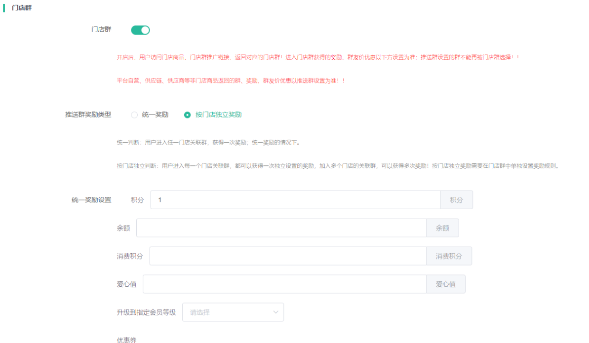 推送群奖励类型选择 门店独立奖励时 门店需要设置奖励