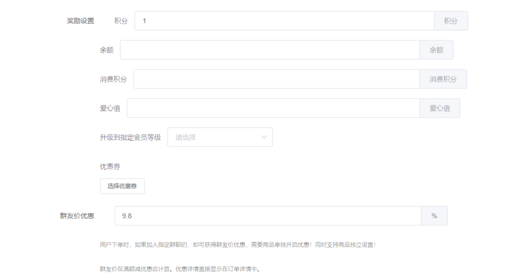 奖励设置:设置领取页面的奖励积分、余额、消费积分、优惠卷,升级到指定会员等级(如选择等级比会员自身所处会员等级低,不会降级)